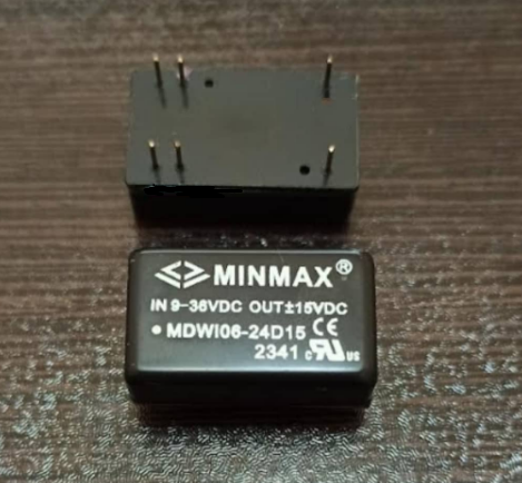 قطعه MDWI06-24D15 یک DC/DC با ولتاژ ورودی 24 ولت (دامنه گسترده 9 تا 36 ولت) و ولتاژ های خروجی 15 -/+ ولت و توان 6 وات است که اورجینال شرکت MINMAX میباشد