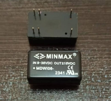 قطعه MDWI06-48D15 یک DC/DC با ولتاژ ورودی 48 ولت (دامنه گسترده 18 تا 75 ولت) و ولتاژ های خروجی 15 -/+ ولت و توان 6 وات است که اورجینال شرکت MINMAX میباشد