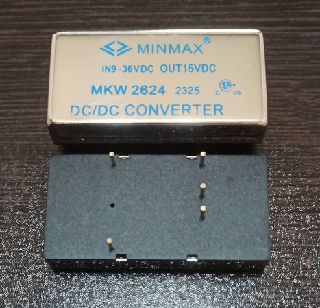 قطعه MKW2624 یک DC/DC با ولتاژ ورودی 24 ولت (دامنه گسترده 9 تا 36 ولت) و ولتاژ خروجی 15 ولت و توان 15 وات (1 آمپر) است که اورجینال شرکت MINMAX میباشد